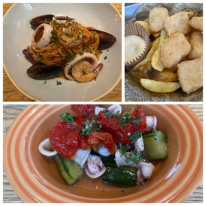 海老とムール貝のペスカトーレフィッシュ&チップスヤリイカと胡瓜のクラフトビールマリネ