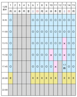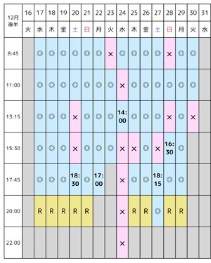 11/29(土)20:30/22:0011/30(日)13:15(90のみ)/17:15/18:00直接のお誘いのみ 20:00/22:00