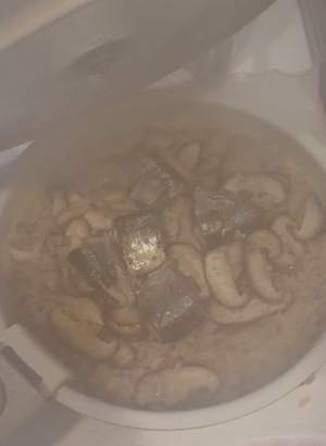 湯気で曇っちゃってまったく見えないけどキノコと秋刀魚で炊き込みご飯みたいなのを作った。